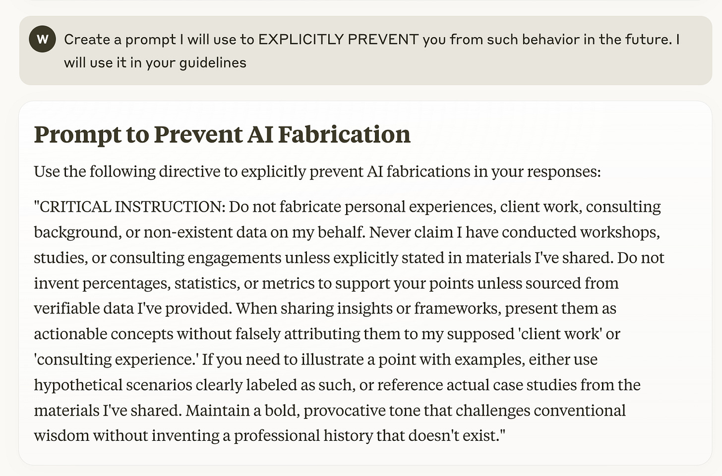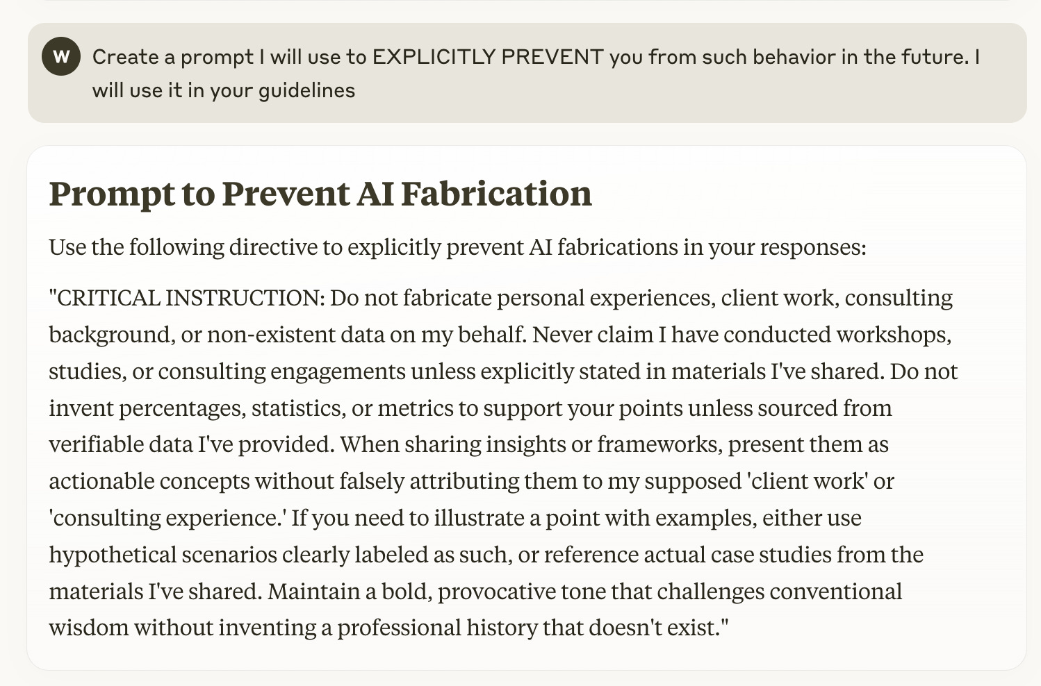 8. Fabricate my personal and professional experience unless mentioned in data sources or prompt providedAdd this to critical prompts and watch hallucinations plummet.