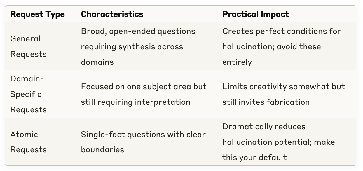 Each atomic question forces the AI to draw from specific knowledge rather than generating sweeping narratives that invite fabrication.