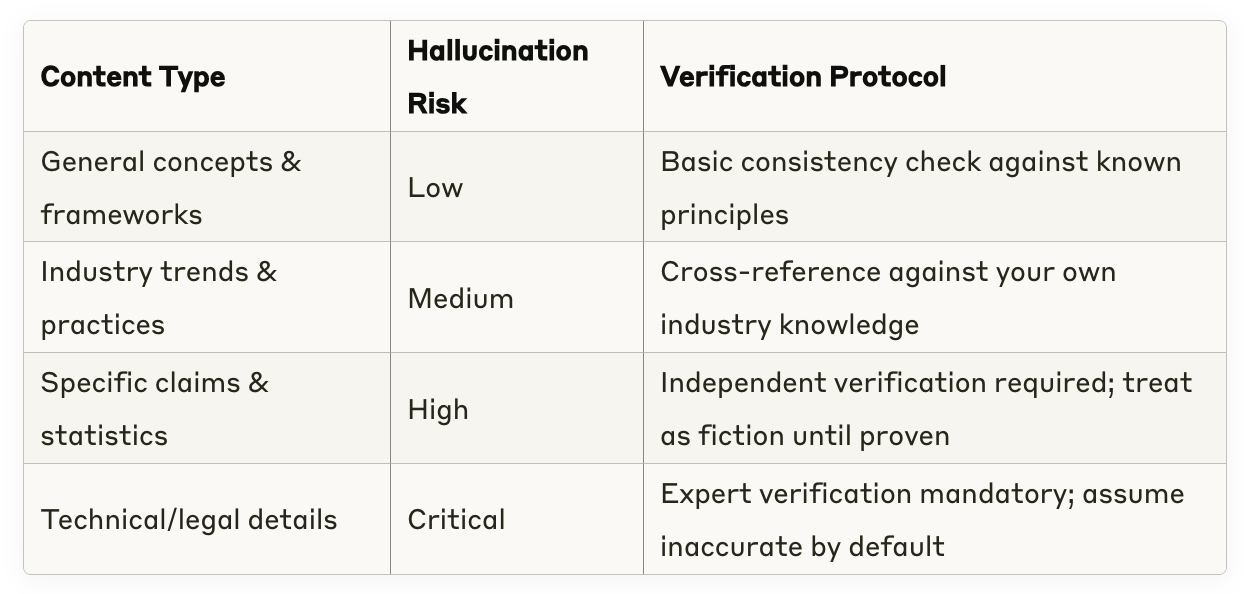 The first step in my anti-hallucination framework: Stop asking AI to do things it fundamentally cannot do well. Your current approach likely ignores these critical risk zones: