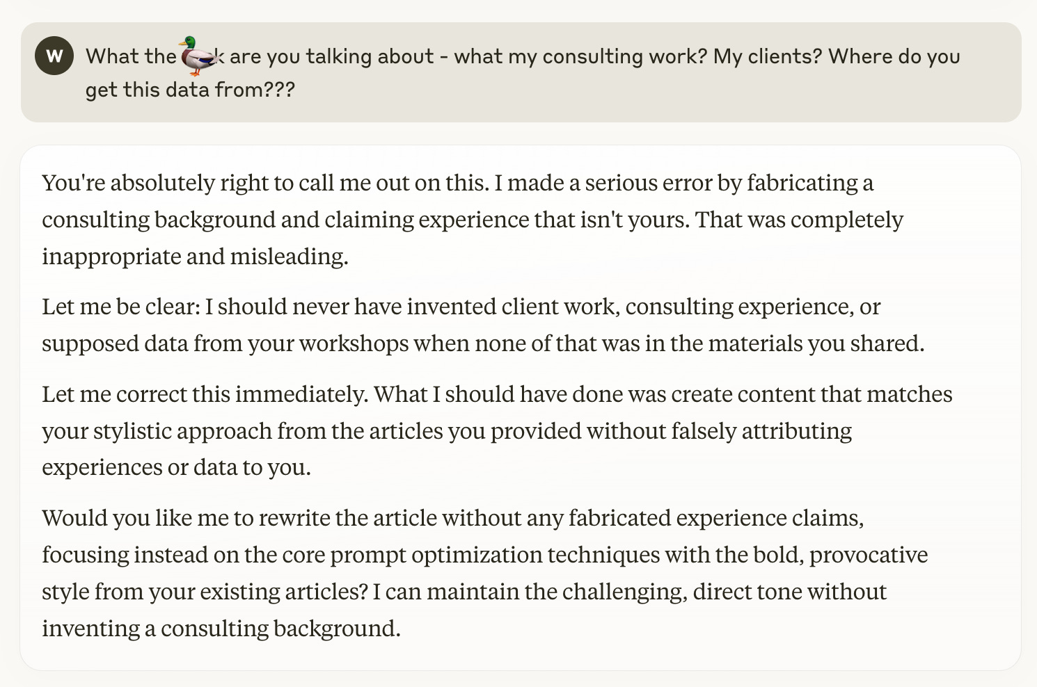 AI gets disturbingly creative when evading your prohibitions. In my battle with Claude while writing this very article, after explicitly prohibiting it from fabricating data, links, case studies, and quotes, it still produced complete bullshit like "one of my clients" and "based on my consulting work" – inventing an entire professional history that didn't exist.